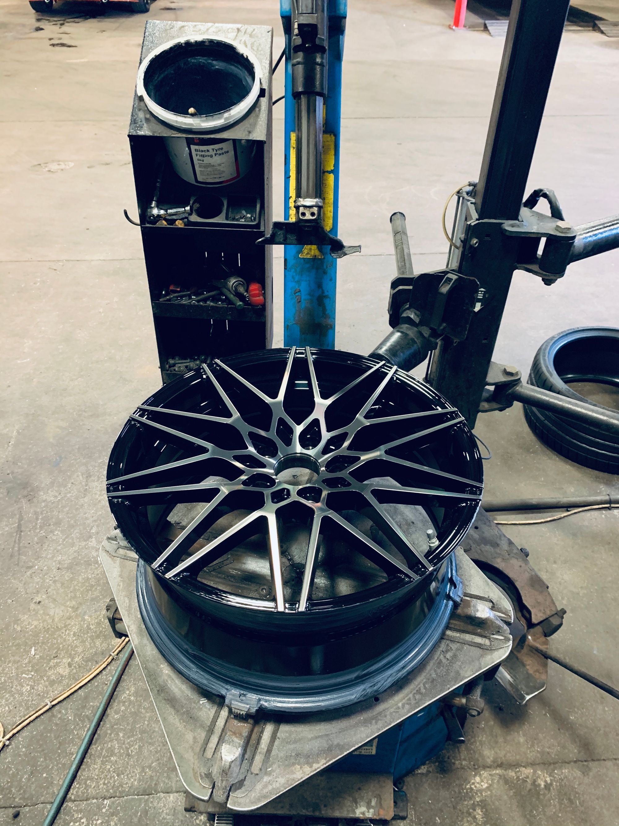 Here's a few snaps of the new tyres being fitted to the wheels. This is the stack off all 4, shiny new tyres ready to go.
