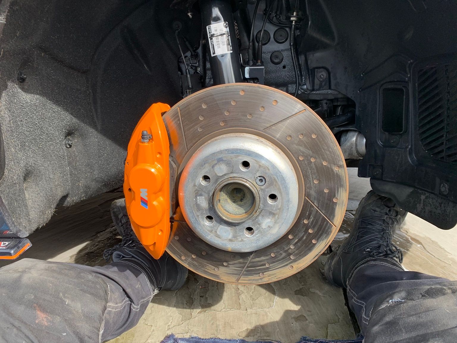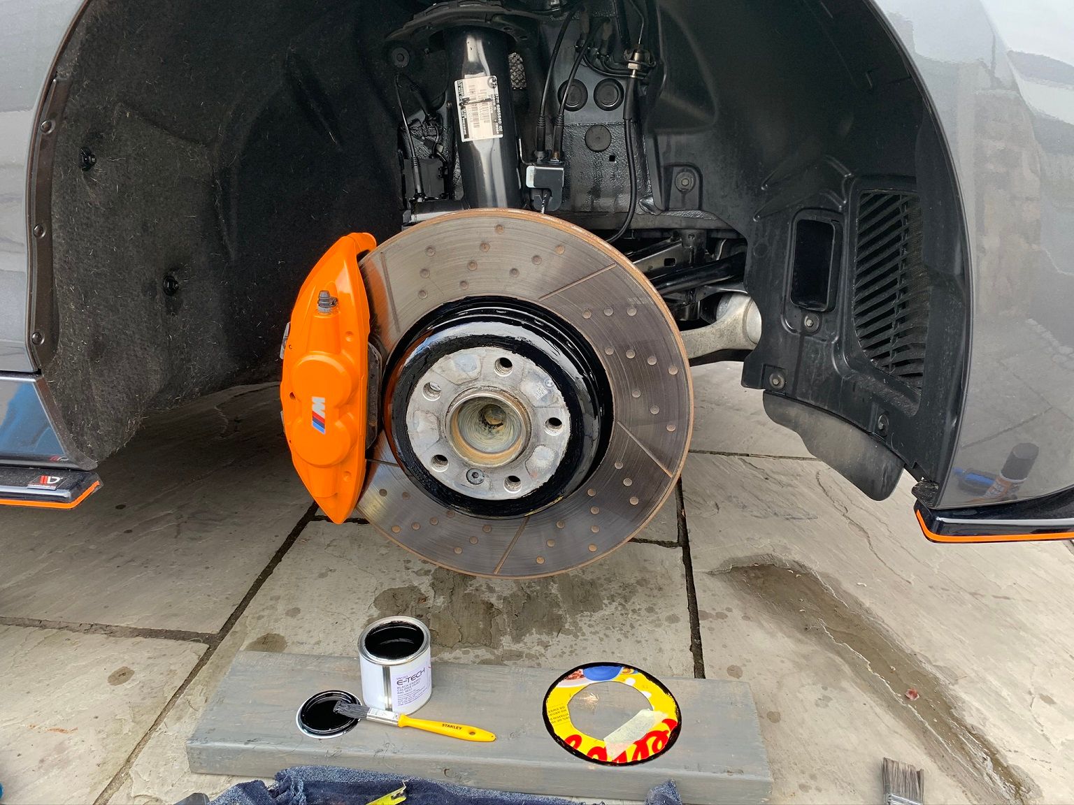 My car is a 'Shadow Edition' and comes with many things in a nice gloss black or just darker than general to give it a more aggressive and menacing look. These giant silver hubs in the background kind of spoil the wheels, once they get a bit dirty or dull they don't look great and eventually they rust and corrode. Not on my car! Here's me with the car lifted and the wheel off ready to get started.