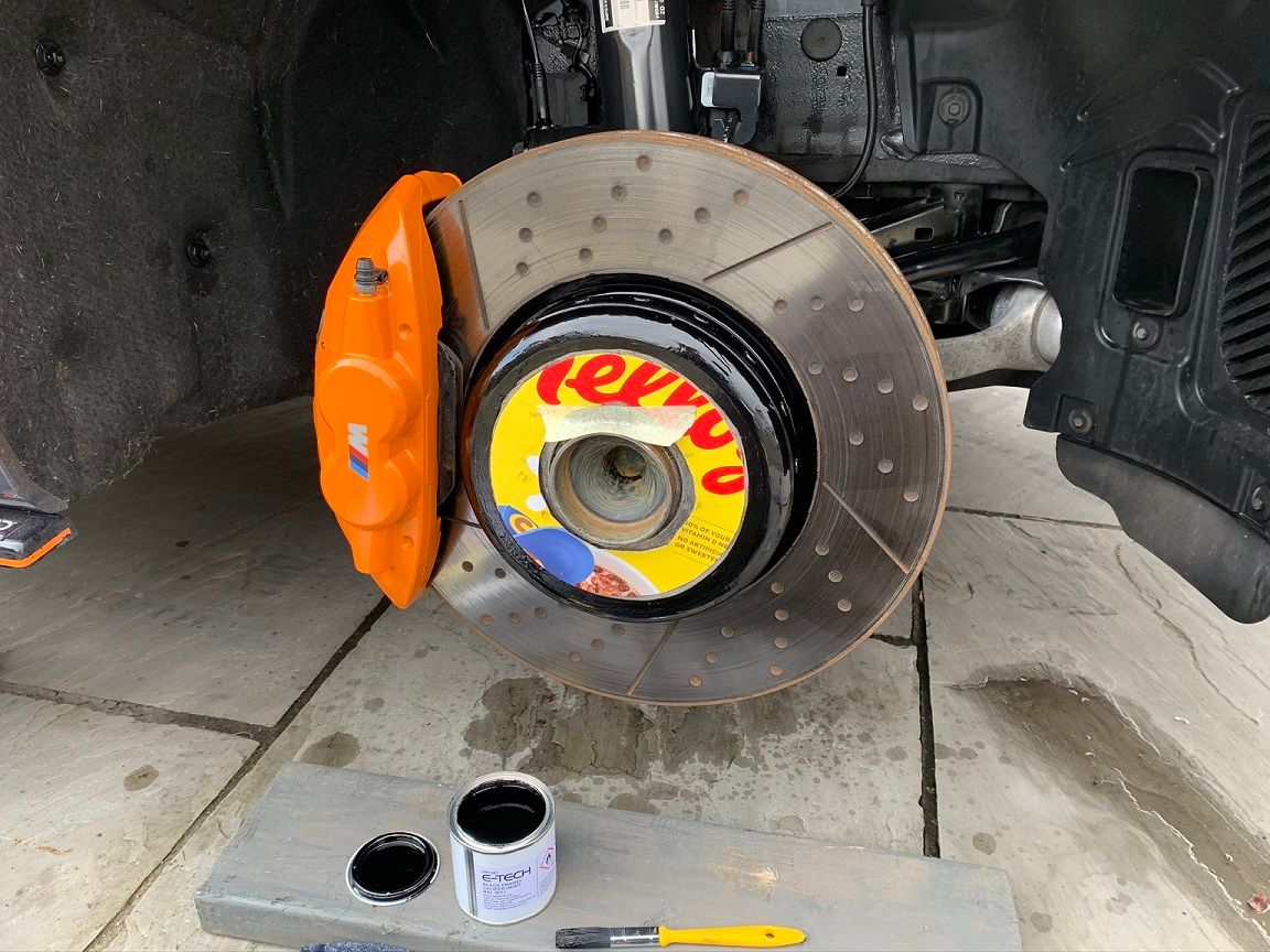 There are two really important things to note here and they are the locations where you must not put any paint! The first is on the brake disc surface itself, as you can see I've stopped right up against the edge of that, and the second is on the mating surface where the wheel mounts to the hub. I made a template out of a cereal box by measuring the diameter of the mounting face on the back of the wheel so I could ensure no paint went on that area of the hub.