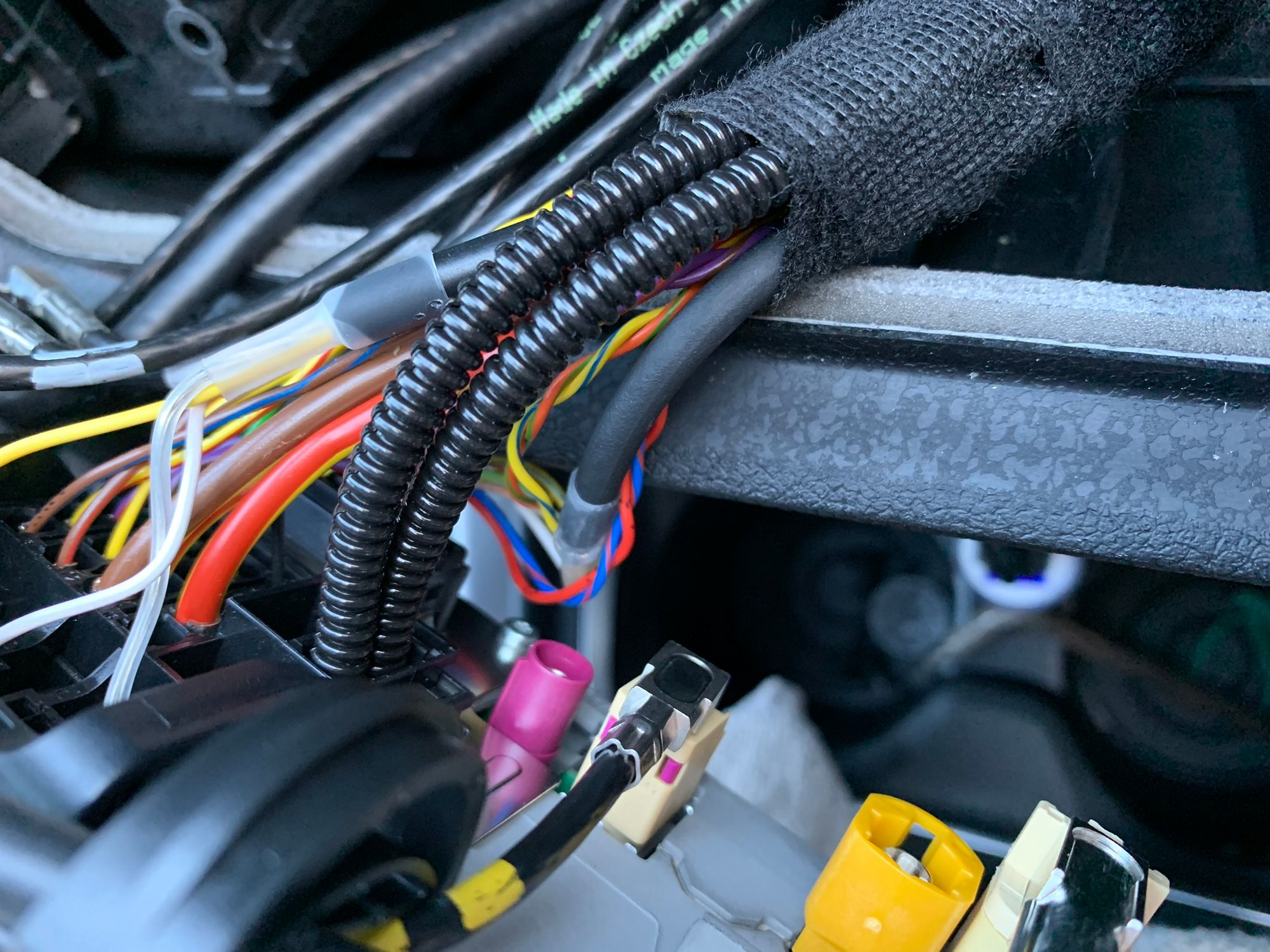 That's a WiFi antenna that connects up to the head unit (stereo) in the car and allows the connection to an iPhone via WiFi. That image is back from Part 5 when I was doing other work that required me to remove the head unit and several other items in the dash and I fitted the antenna back then to save on doubling up on work. Here's the fascia of the head unit removed and the pink connector on the rear of the head unit where the WiFi antenna connects to.