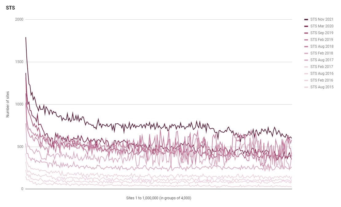 As with other metrics, we see far more adoption of HTTP/2.0 in the more popular sites higher up in the Top 1 Million ranking with the trend lines just crossing before we drop out of the Top 1 Million sites.