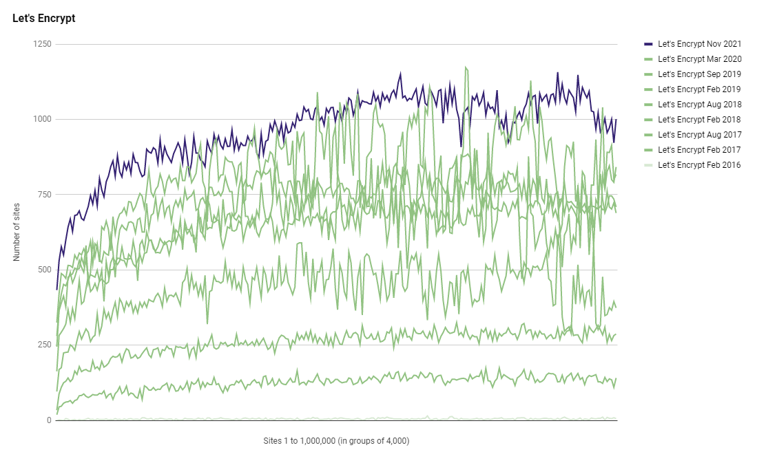 I started tracking how many sites used Let's Encrypt back in 2016, just after they started, and I've watched them go from not existing in the Top 1 Million to where they are now as the largest issue of certificates for the Top 1 Million!