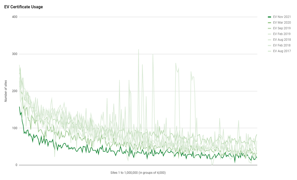 We've now got a lower number of sites using EV certificates than at any point in history that I've been doing these reports. After seeing a peak a couple of years ago, the downward trend in the use of EV is now quite stark!