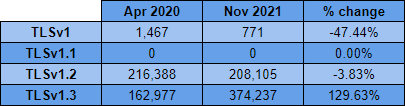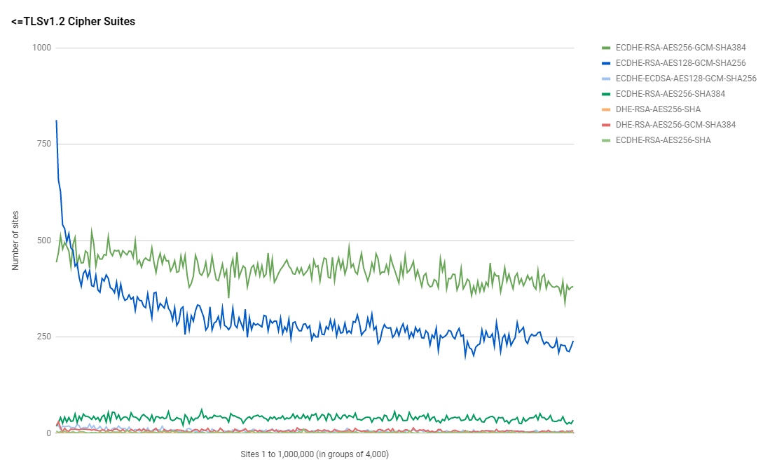 Another great point here is how well we're doing with keeping TLSv1.1 at zero usage and also reducing the usage of TLSv1 by almost half. Both of these protocol versions are deprecated so if you are using them, it's time to update and move to a minimum of TLSv1.2 instead.