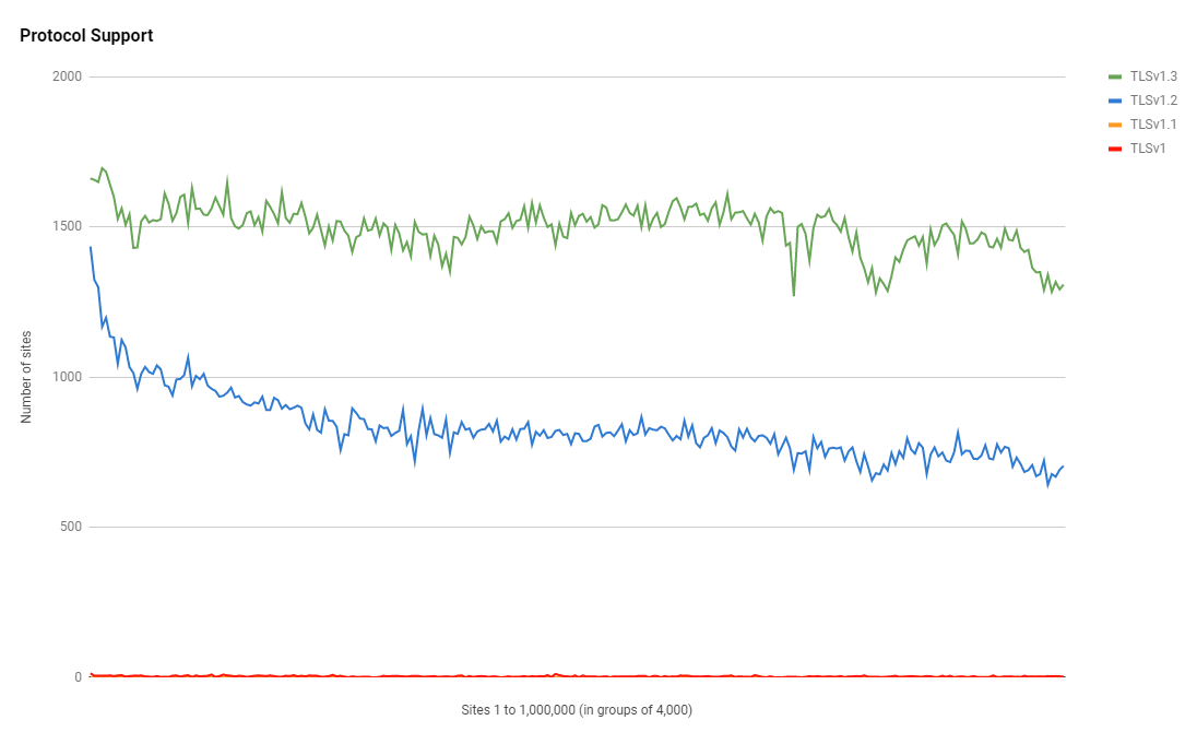 We can see that TLSv1.2 support is still quite popular in the largest sites but even with that preference from the largest sites out there, there is no segment of the Top 1 Million sites where any protocol out performs TLSv1.3 as the most popular protocol.