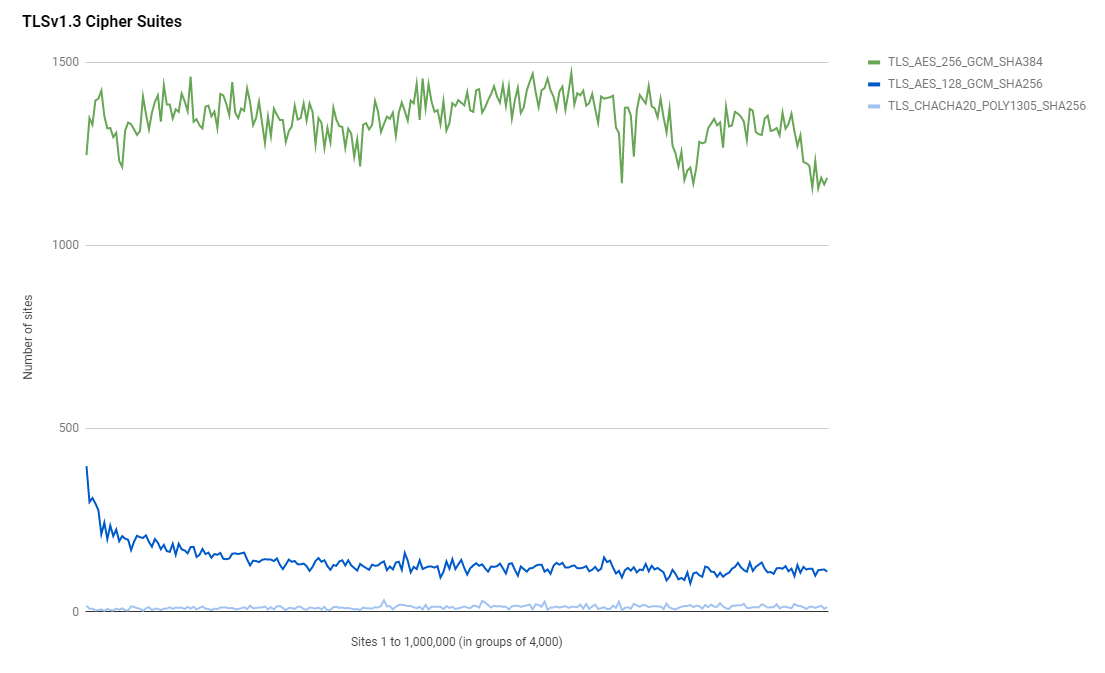 ECDHE-ECDSA-AES256-SHA 1Unsurprisingly we can see that a TLSv1.3 cipher suite has taken the top spot and by quite some considerable margin too. Given the huge growth in Cloudflare certificate in the Top 1 Million and the apparent large presence of Cloudflare CAA records mentioned above, I'd bet that a large amount of this TLSv1.3 support is also coming from Cloudflare. What does continue to be of interest is that the most popular cipher suite, TLS_AES_256_GCM_SHA384, uses AES256 and not AES128 which is the same when we look at the second most popular cipher suite of ECDHE-RSA-AES256-GCM-SHA384 too. Here's the usage of <=TLSv1.2 cipher suites followed by the usage of TLSv1.3 cipher suites.