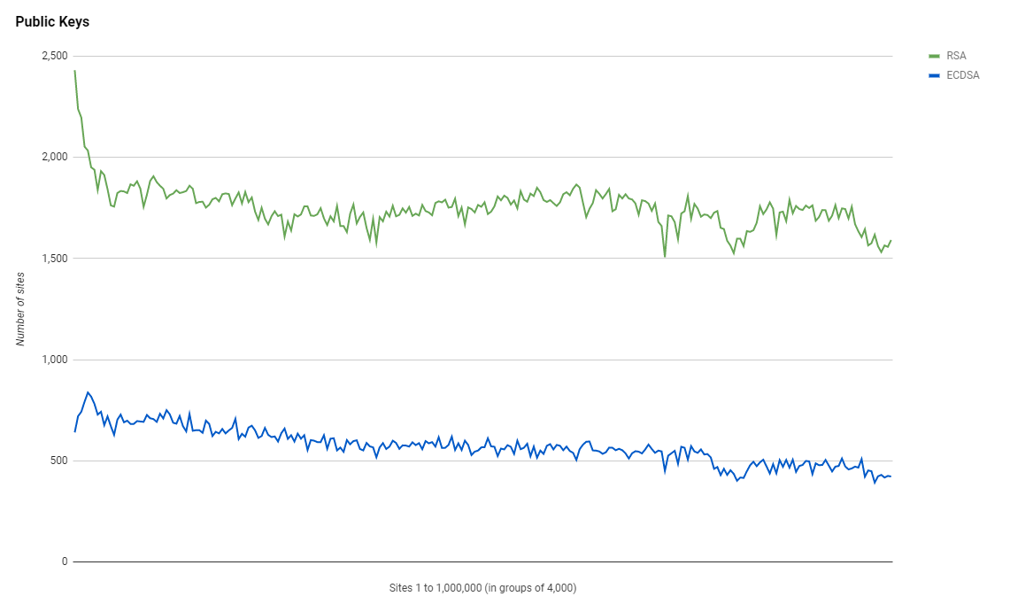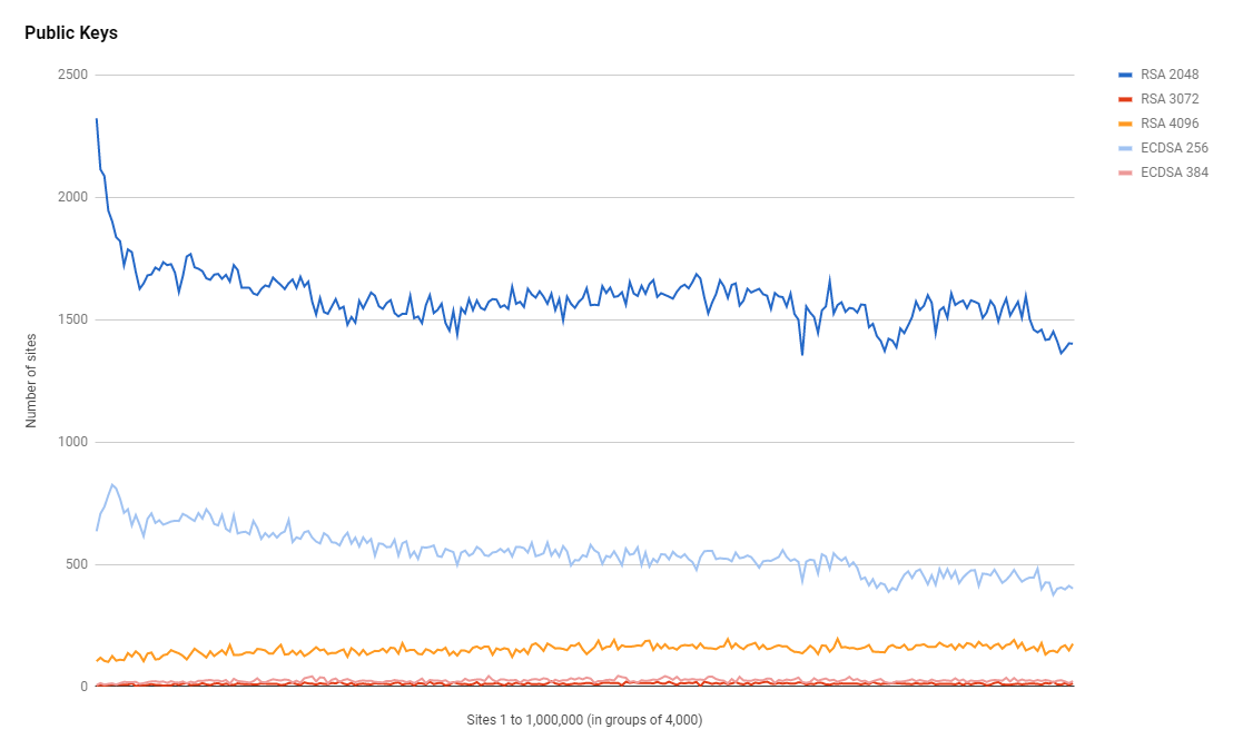 This is a shame and somewhat surprising as I would have expected that the rise in adoption of TLSv1.3 usage would have driving the ECDSA numbers up much more. One of the main reasons to keep RSA around for authentication is legacy clients that don't support ECDSA yet, but that seems at odds with the huge rise in TLSv1.3 which isn't supported by legacy clients! We also continue to see use of RSA 3072 and RSA 4096 in numbers that are concerning.