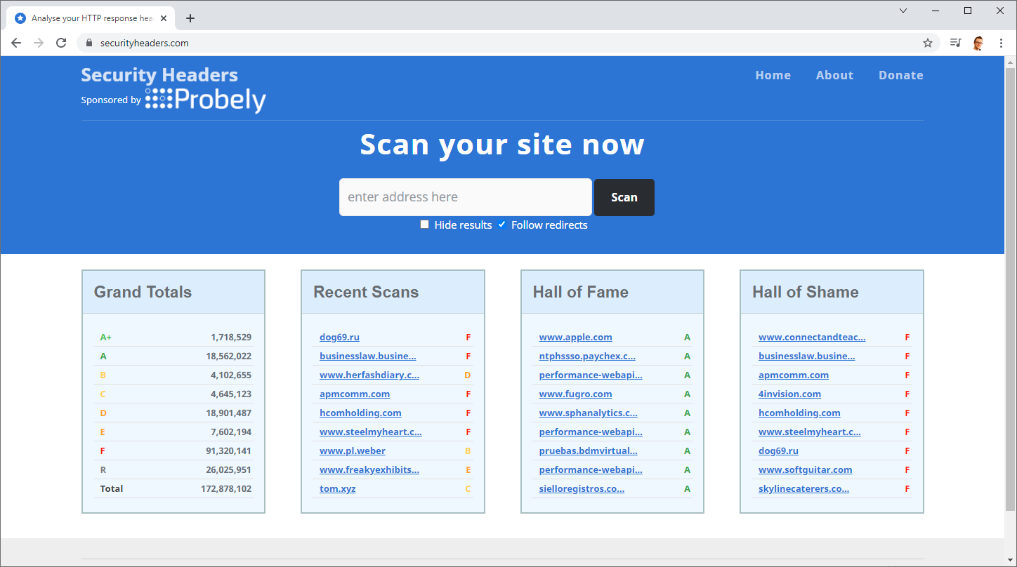 Again we see the more popular sites be more likely to score a higher grade, but across the board, overall, we're doing much better than we were on the last report.