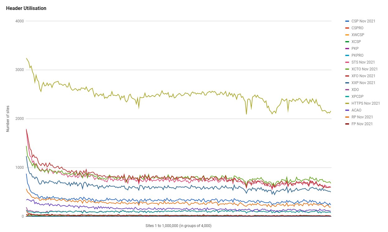 The reason this all started! Looking at the adoption of Security Headers over the years was the main reason this crawler project started. It has since evolved to analyse so much more than just HTTP response headers, but we can't forget the reason this all started.