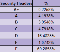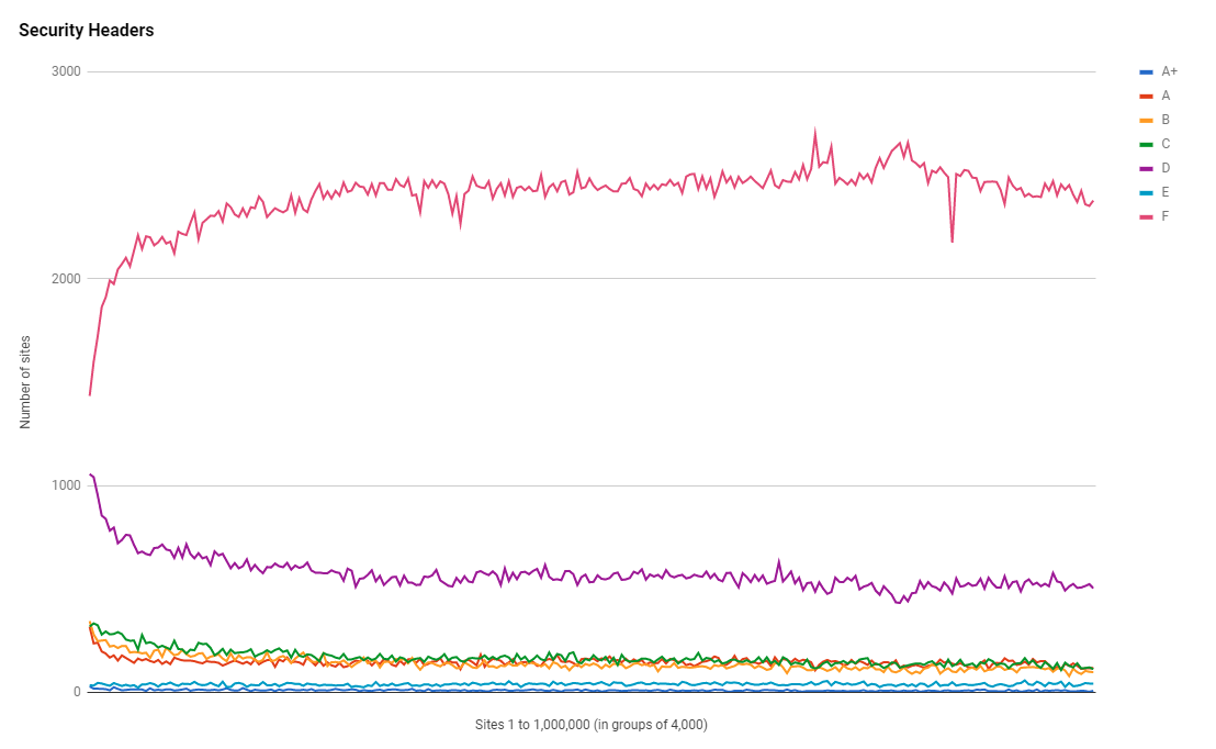 The larger sites have always been better at using headers, but still, the increase in usage has been present all the way across the ranking from the most popular site in the Top 1 Million to the least popular. With the increase in the use of security headers comes an increase in the grads that sites are scoring on the Security Headers tool too.