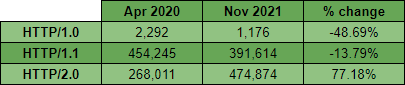 In the April 2020 update I added support for HTTP/2.0 to the crawler so it could detect sites that supported the latest version of HTTP. Β In that update blog post, I published the numbers for version support as they stood back then.