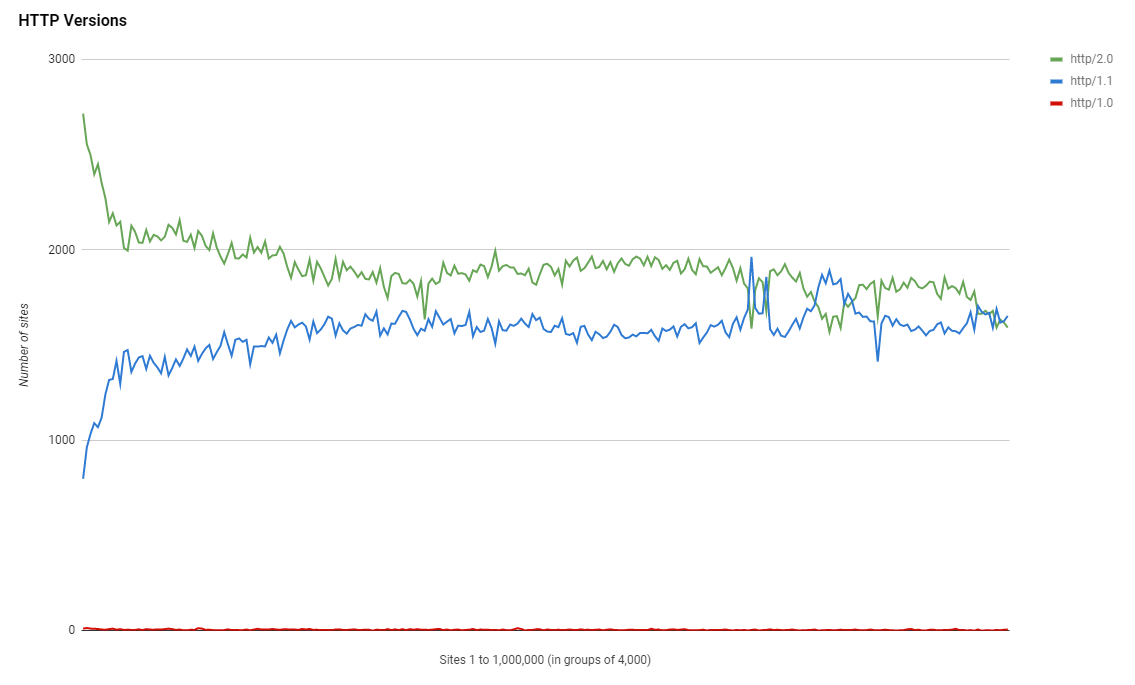 HTTP/1.1 was still the most dominant protocol with almost double the number of sites supporting it compared to HTTP/2.0 at the time. Fast forward to the present day though and we can see HTTP/2.0 has enjoyed a huge surge in support!