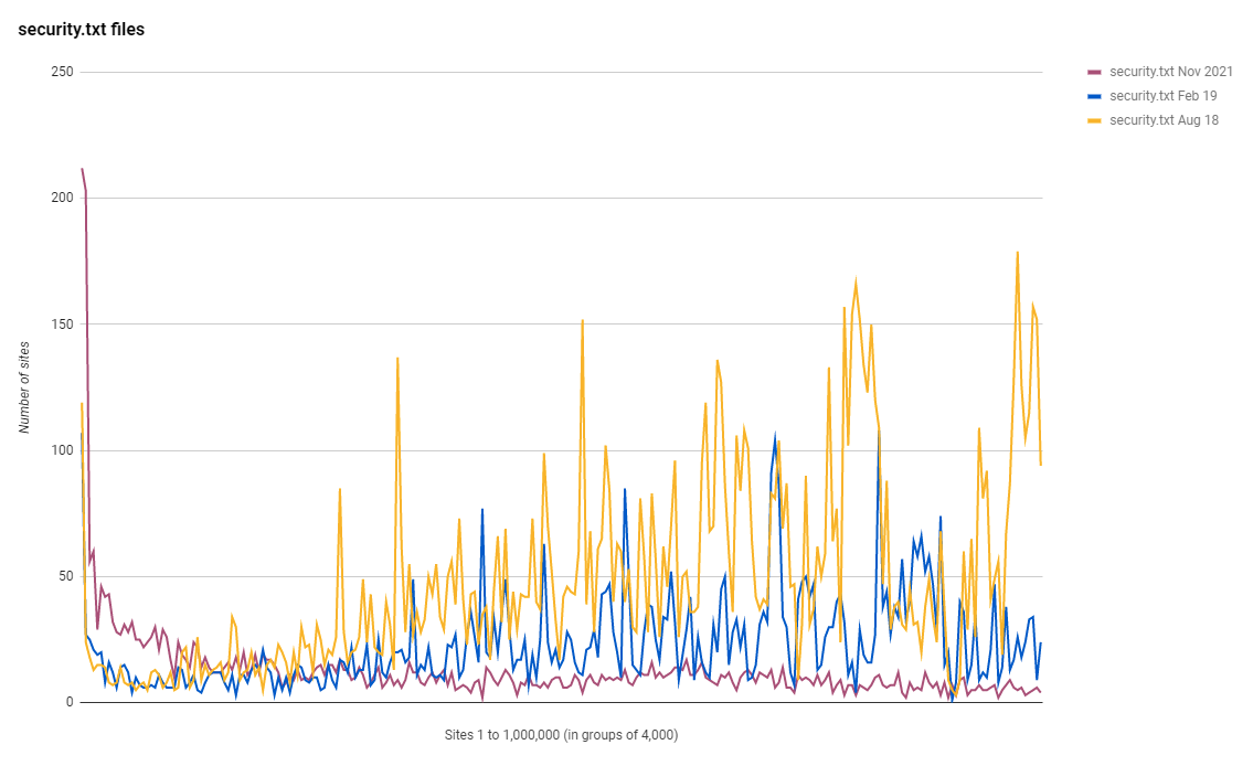As you can see, the more popular and higher ranked sites in the Top 1 Million are now publishing a security.txt file in larger numbers, but, overall that hasn't helped as sites lower down the ranking are publishing them in smaller numbers. It's difficult to explain trends like this without further analysis, but that trend line does not look good for Nov 2021.