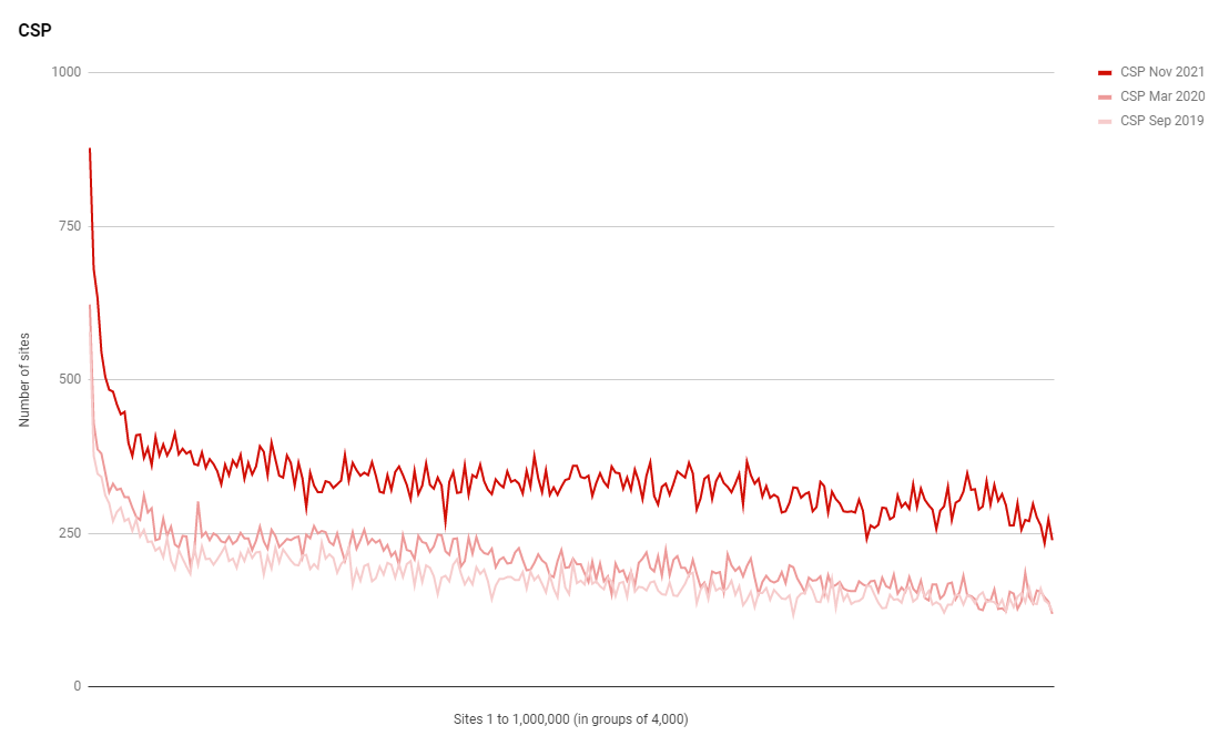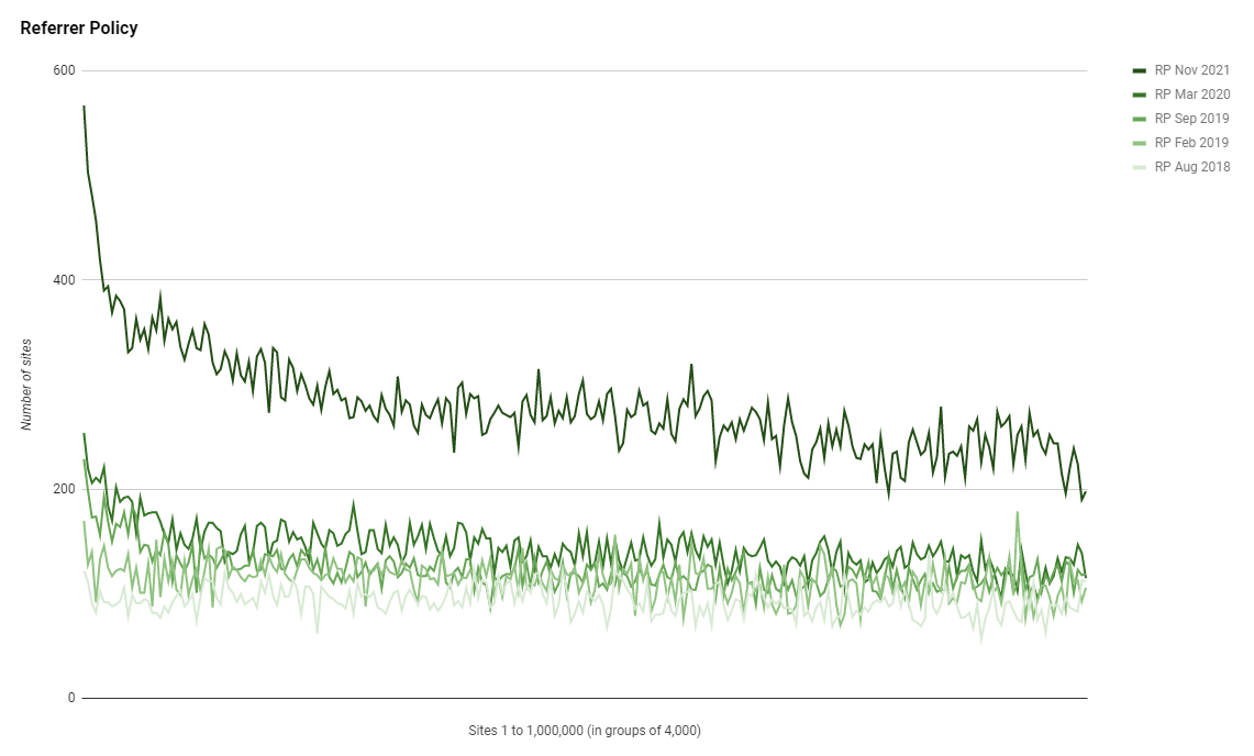 A security header that's seen quite a large amount of growth, Referrer Policy now has a substantial amount of usage across the Top 1 Million sites. It's nice to see security features being deployed faster than previous trends would have allowed us to predict.