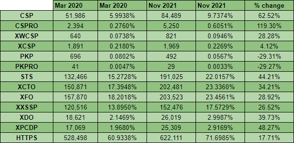 This is the first of the two reports, being published now in Dec 2021 and you can head over to read the full thing cross-posted on the Venafi site. The second report is planned for May 2022 so we can see what changes happen in the ecosystem over the next 6 months. I'm really grateful to Venafi for stepping up to sponsor these activities as it supports the project and gives it some funding to continue and shows their support for the community too. This report, the data used in this report and everything else will still remain free to access and read for everyone, just like it was before. Drop by the Venafi website or give them a shout on social media to say thanks, I'd really appreciate it!