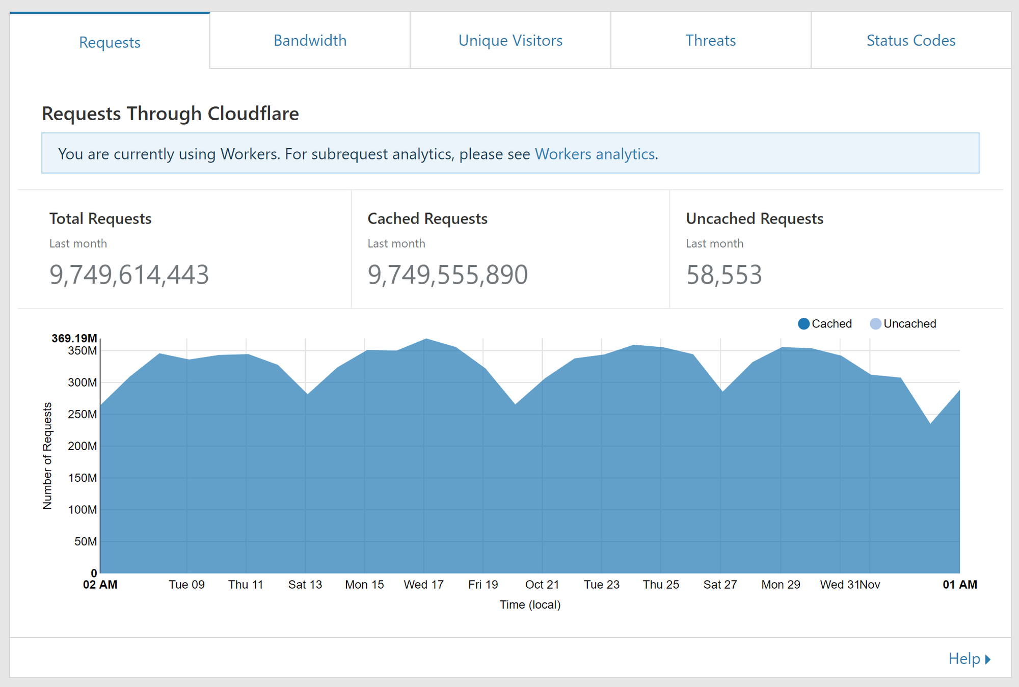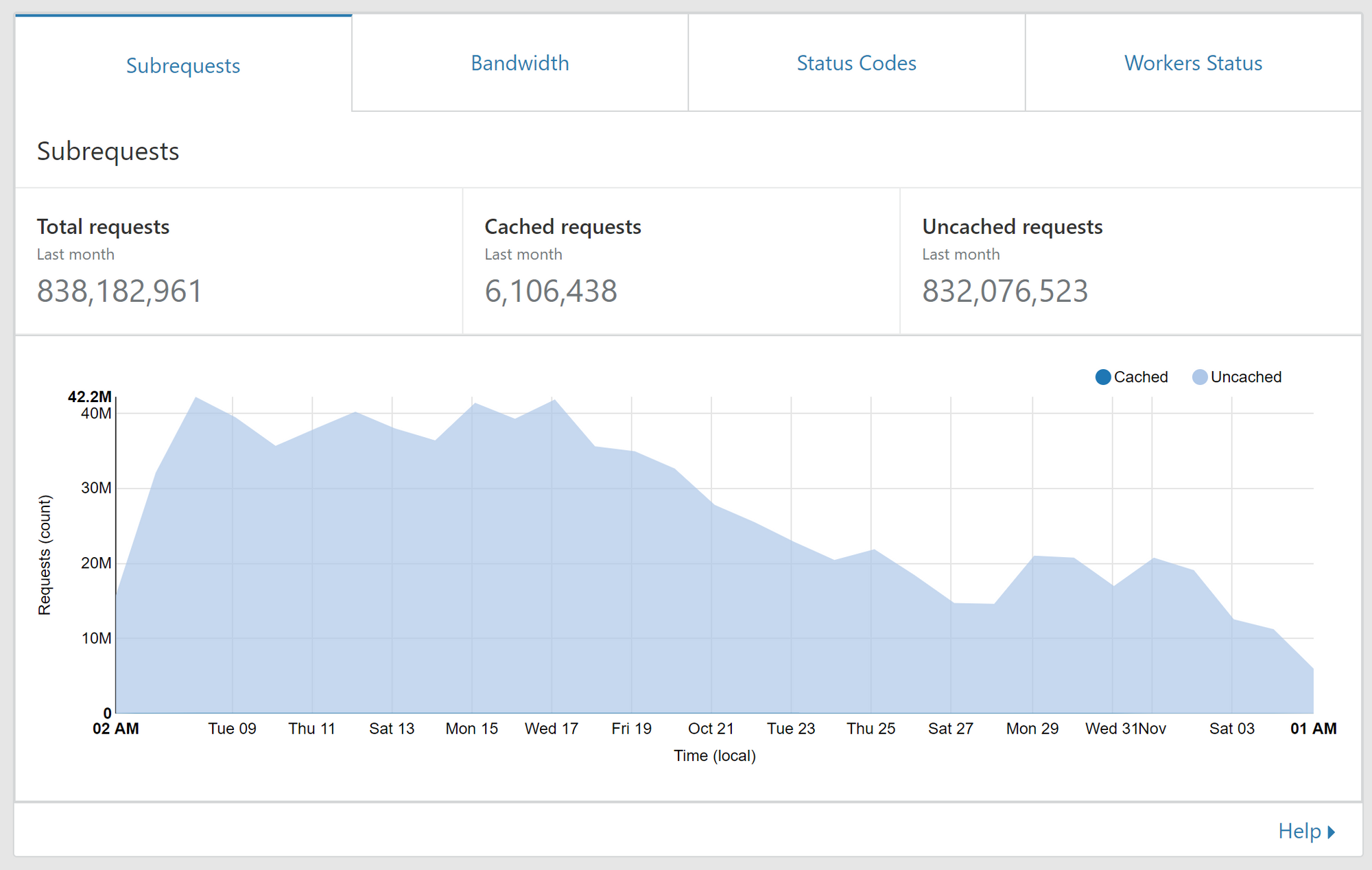 So that's the total number of requests that hit us and for clarity, we deployed the change on Oct 21. As you can see, no change in our normal volume. These requests are then fed into the Worker and the Worker may or may not make a request to our origin. You can also look at the amount of subrequests your Worker is making.
