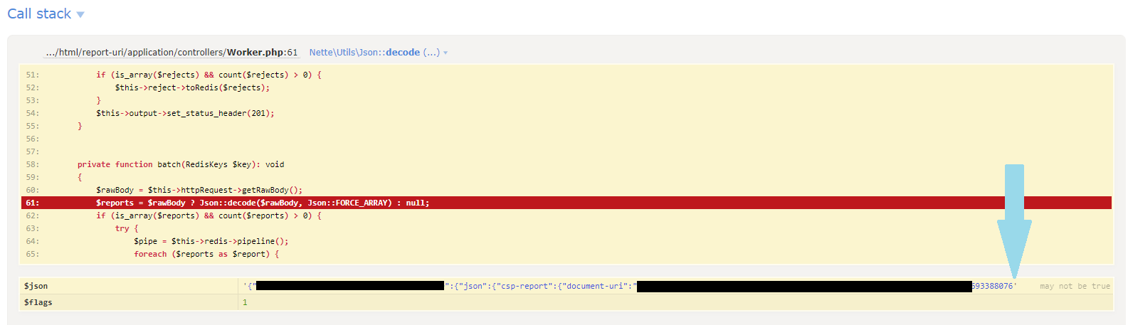 When the Cloudflare Worker talks to our origin, there are three endpoints that reports can be sent too. We have batch_reports() which is for a batch of reports to be processed as normal into your account and visible in the Reports/Graphs pages, we have batch_wizard() which is for a batch of reports that were sent to the CSP Wizard, and then batch_reject() which is for reports that the Worker rejected and only need to be counted in your Rejected Reports metrics but not otherwise processed. The vast majority of the exceptions being thrown when parsing the JSON were for requests sent to the batch_reject() endpoint, the one that seemingly has the least to actually do! I decided to walk through the code and refresh my memory because, after all, this was written quite a number of years ago. Here are the three methods, nice and simple: