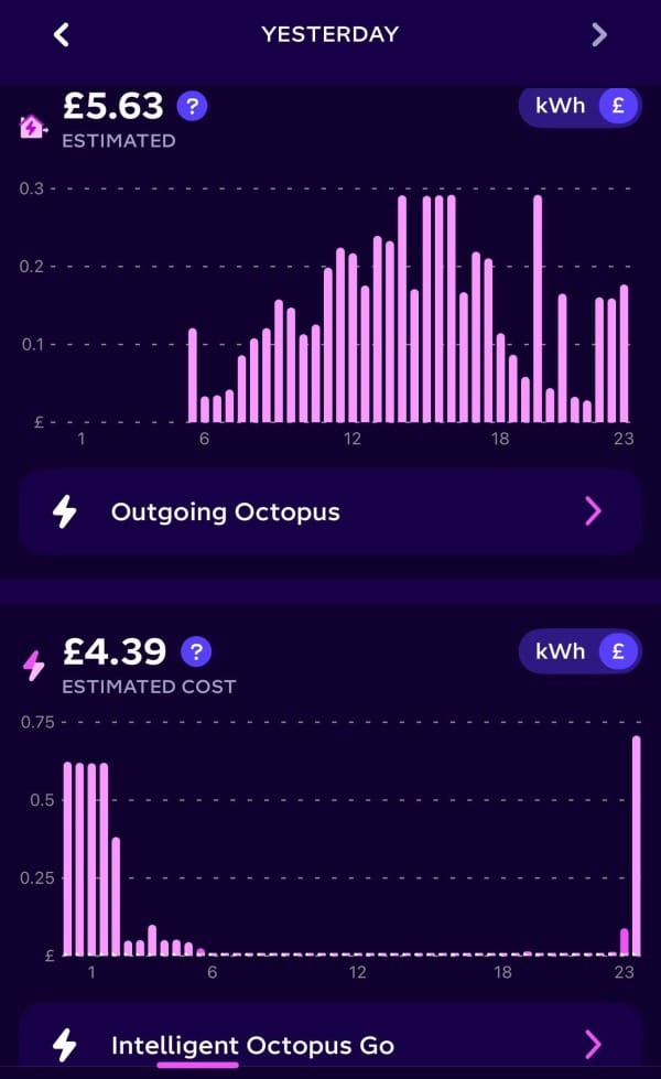 The top graph shows our export for the day and you can clearly see the Solar Bell (the solar production bell curve) from sunrise to sunset. Dotted throughout the day you can also see the occasional spikes in our export, where the automation has detected excess capacity in the batteries and released it into the grid, causing a spike in our 30 minute export window. You can then clearly see the exponential decline for battery capacity kicking in as we release excess battery capacity late into the evening. The bottom graph then shows our import, which looks very different, hauling in that cheap power overnight and not importing any energy during the day. If you want to see those graphs as kWh instead of cost, here they are.