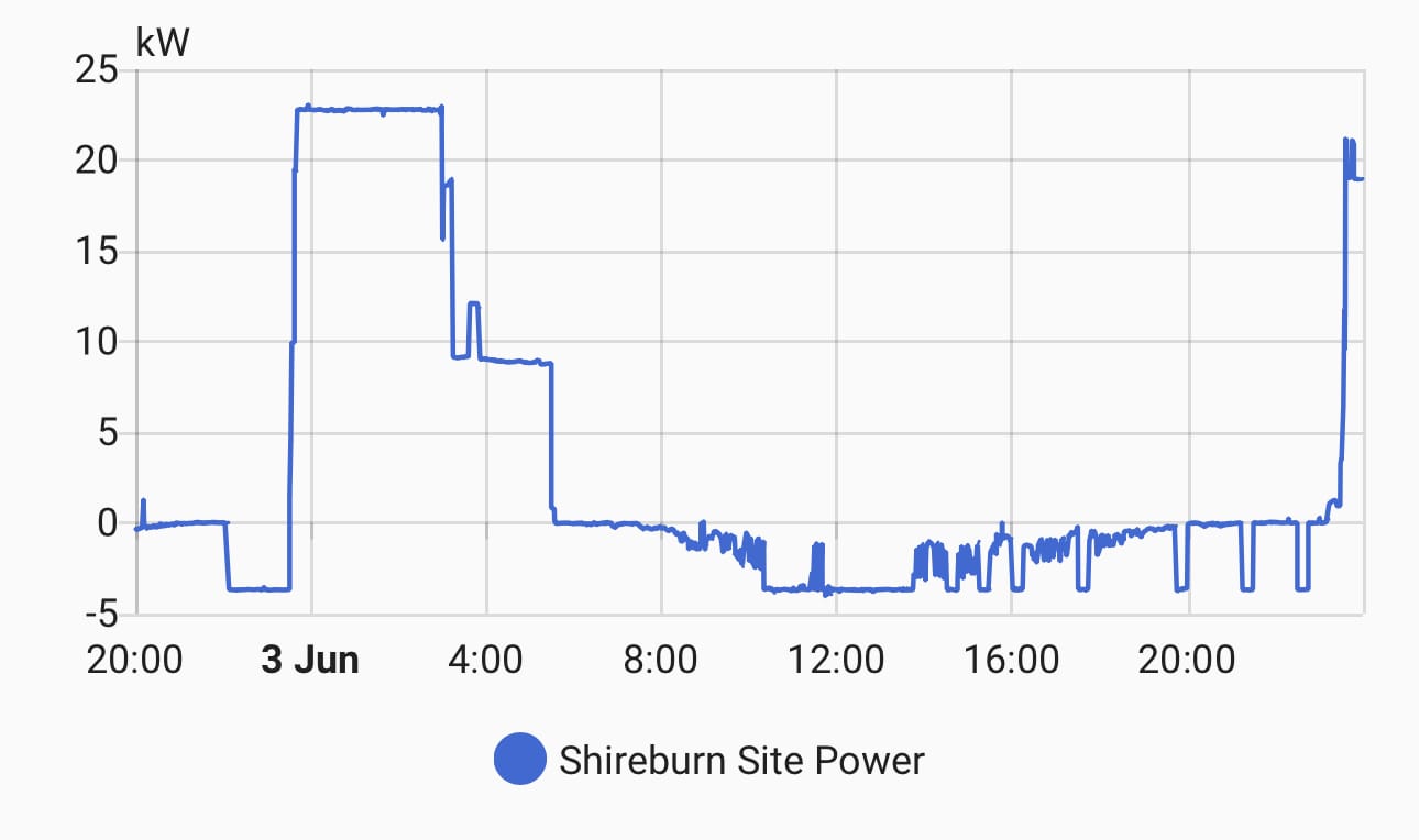 This means that we can quite easily hit our maximum import limit of 24kW, at which point the Powerwalls will automatically throttle their import to prevent us from exceeding the limit and blowing our 100A main fuse (100A x 240v = 24,000W). Given that we have a 24kW import limit, you'd think that we have a 24kW export limit too, but, we don't... For reasons known only to them, our Distribution Network Operator determined that we are only able to export at a maximum rate of 3.869kW, which you can see on the negative portion of the graph during the day where we hit the flat bottom of our maximum export rate.