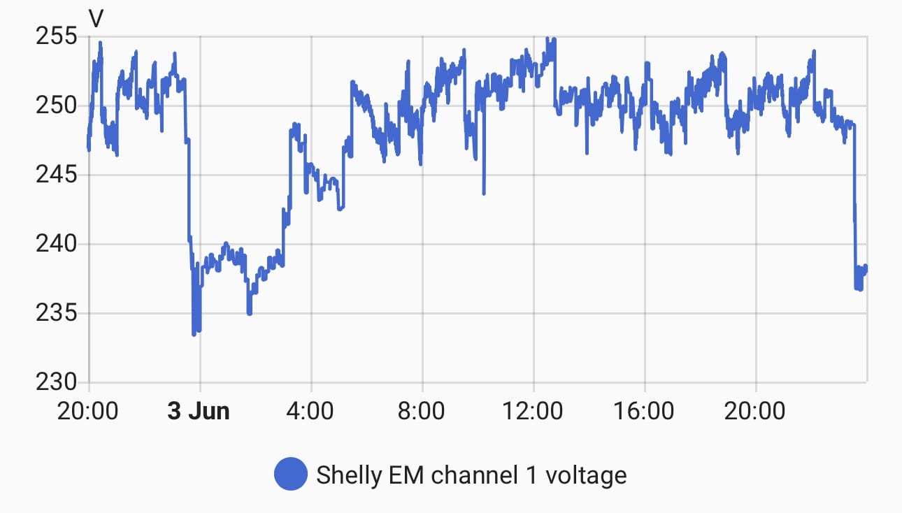 Side note: Yes, I know our nominal voltage on the grid in the UK is 230v after we harmonised with Europe, but in reality, it's often much higher. My 100A fuse is also BS1361 rated, meaning it can realistically carry 120A indefinitely, and last for prolonged periods at 125A. Even at our minimum tolerance on grid voltage of 207v, we'd still only be pulling 116A at 24kW (24,000w / 207v = 116A). Here's the grid voltage for the same time window shown in the above graph to show what I mean.