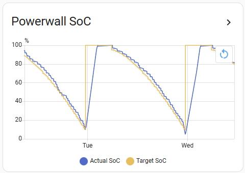 If you look at the graphs above for Actual SoC, you can see the step changes every 15 minutes when the automation runs and changes the export mode to adjust the Actual SoC as needed, keeping things well aligned! One thing I am keeping in mind is that we're in summer right now, so our solar production is quite good and our energy usage is probably on the lower end of what's typical. As we approach autumn and then winter, I'm wondering if I might need to make the Target SoC curve a little steeper, to hold a higher charge during the day and tail off more aggressively in the evening, to give us a little more breathing room. Only time will tell on that one, but if there's a change required, I will come back and update this post with a note.
