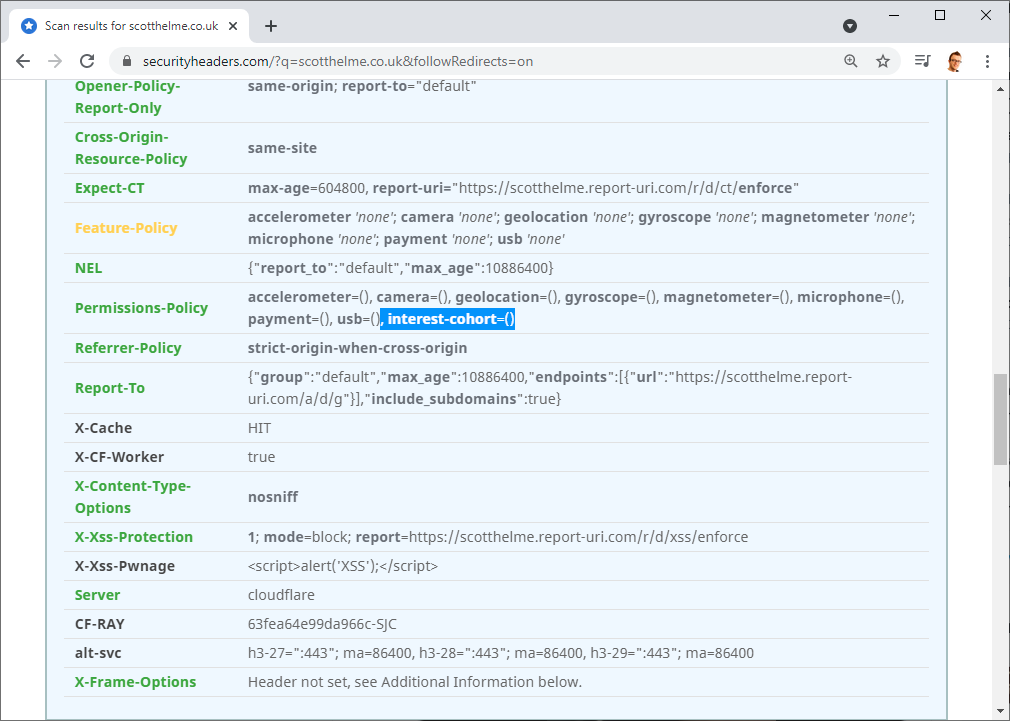 Along with updating my crawler to look for and produce the information about FLoC, I've also updated Security Headers so it is aware of the new Permissions Policy directive and will highlight it accordingly.