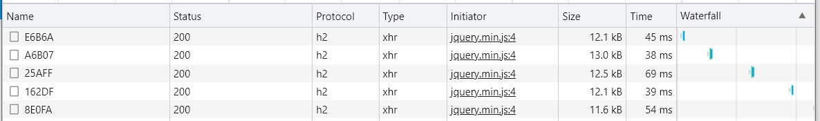 Taking those same 5 candidate passwords and running them against the Pwned Passwords API, considering our expectation from the above table, I got the following times in Chrome.